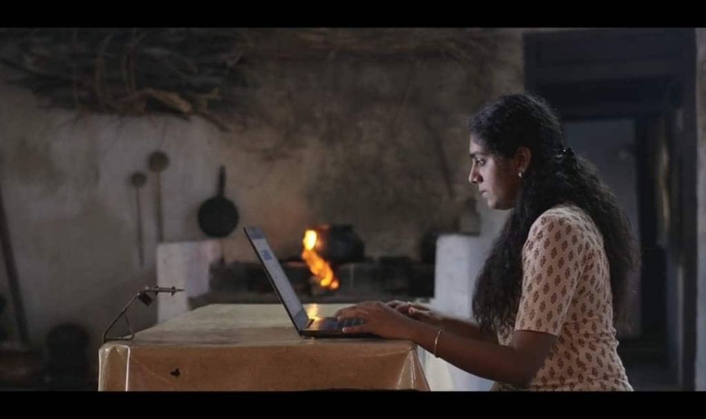 - கல் அடுப்பு எரிய (அவ்வீட்டு ஆண்களுக்கு கல்அடுப்பு அரிசிச்சோறுதான் வேண்டும்) அதன் முன்பு மடிக்கணணியில் வேலை பார்க்கும் நாயகி. பழமையையும் நவீனத்தையும் ஒரே சமயத்திற் சுமக்க நிர்ப்பந்திக்கப்பட்ட பெண்.